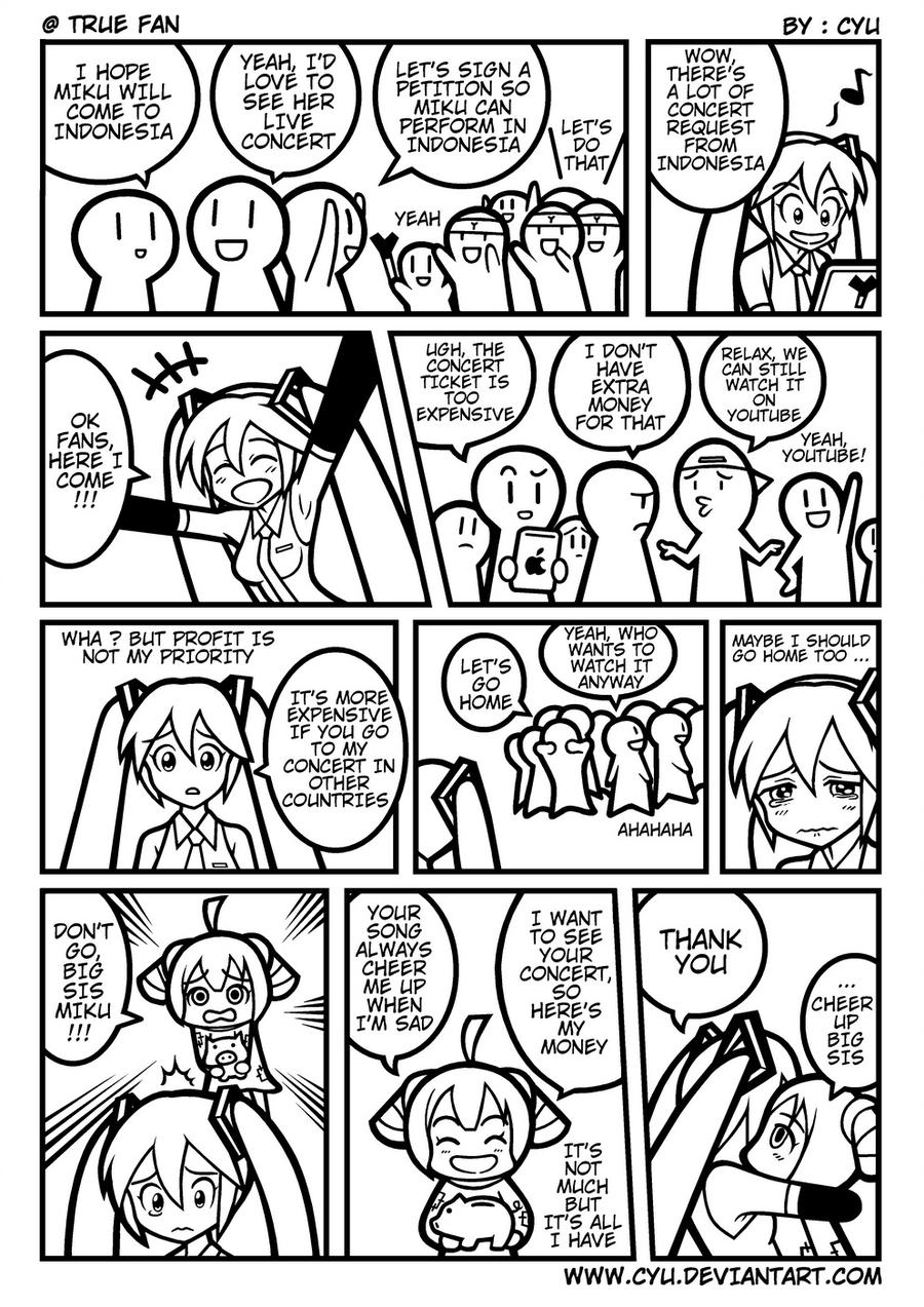 Seorang illustrator bernama Chibi Cyu turut membuat komik singkat tentang drama ini. Ia prihatin akan “penggemar Vocaloid” Indonesia yang memilih untuk menonton konser Miku secara ilegal. Kejadian ini membuat Miku sangat sedih, tetapi ia menjadi terhibur karena masih ada penggemar sejati yang memberikan dukungan untuknya. Komik yang dibuat pada tanggal 11 Mei 2014 ini telah dibagikan sebanyak 977 kali.