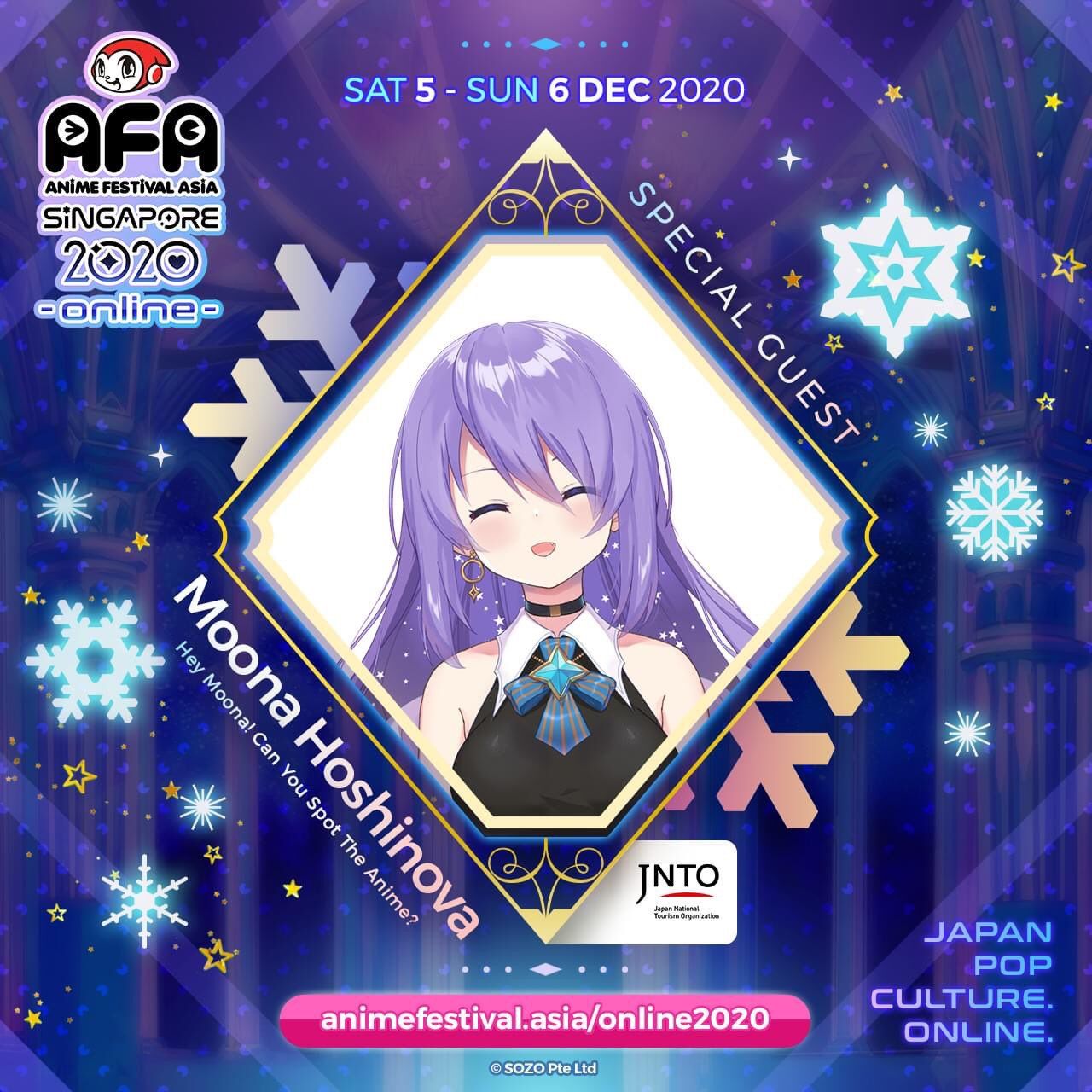 Virtual Youtuber (VTuber) eksentrik, unik, lucu, memiliki hobby bermain game, menari, sangat menawan dan serba bisa! Moona adalah karakter kreasi Hololive Indonesia (ID) dengan jumlah subscriber Youtube Livestream mencapai 318K. Di Arena AFA ONLINE 2020, Moona akan membawakan segmen "Can You Spot The Anime" Challenge! Ikuti Live Chat bersama Moona di Community Chat dan menangkan Giveaway dari Japan National Tourism Organization (JNTO)