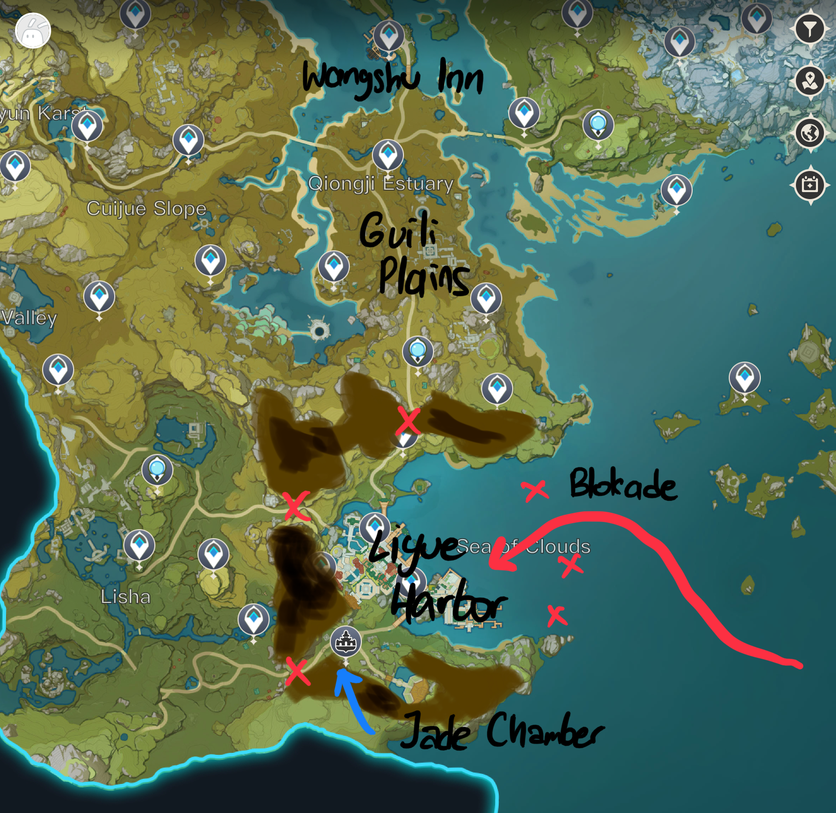 Liyue Harbor dikelilingi oleh gunung di ketiga sisinya. Tapi, jika Liyue Harbor diserang dari laut, habislah sudah.
