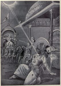 Lantas Khrisna mendekati Arjuna, berdialog dan menyampaikan tetuah padanya mengenai bagaimana ia, sebagai Ksatria, memiliki tugas yang tak dapat dihindari untuk bertarung dan berperang. Menghindari tugas (dharma) bagaimanapun juga, Arjuna adalah Ksatria, dan Ksatria harus berperang. Percakapan mereka berdua menjadi bagian penting dalam Bhagavad Gita, skriptur suci umat Hindu.