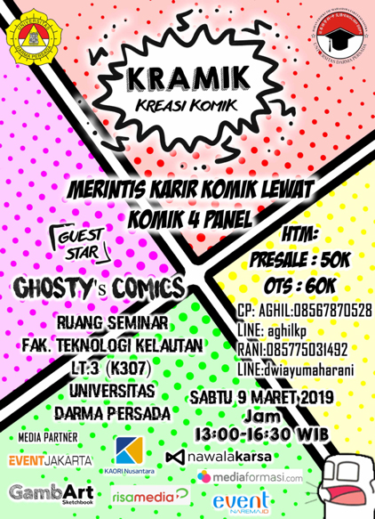 Lalu, kapan dan di mana Seminar KRAMIK ini diselenggarakan? Tidak perlu menunggu terlalu lama, pasalnya seminar komik yang dibintangi author dari GHOSTY’s COMIC ini dijadwalkan terselenggara pada Sabtu, 9 Maret 2019. Lokasi acaranya pun bisa dibilang cukup strategis dan mudah dijangkau dengan transportasi baik umum maupun pribadi, yaitu di lokasi Universitas Darma Persada itu sendiri, tepatnya di gedung Fakultas Teknologi Kelautan, ruang seminar lantai 3 dengan nomor ruang K309.
