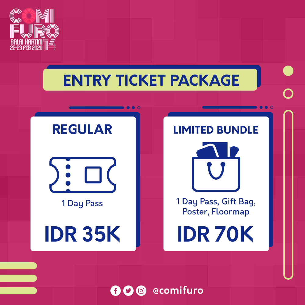 Comic Frontier 14 akan dilaksanakan pada pada 22-23 Februari 2020 di Kartika Expo dan Grand Ballroom Balai Kartini, Jakarta Selatan. Tiket masuk acara dijual dengan harga Rp 35.000 yang bisa diperoleh melalui loket tiket di lokasi acara yang di buka sejak pagi hari. Terdapat juga tiket limited bundle yang meliputi 1 Day Pass, Gift Bag, Poster dan Floormap dengan harga Rp 70.000. Kini, Comic Frontier 14 hadir dengan area yang lebih luas untuk mengantisipasi antusiasime yang luar biasa dari para pengunjung yang hadir.