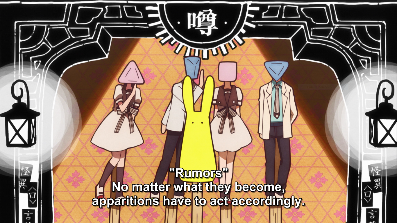 Cara serial ini memanusiakan karakternya yang bukan manusia tidak hanya dari fisik yang antropomorfis, tetapi juga dari latar belakangnya. Alih-alih menjelaskan perilaku supernatural sebagai 'tidak dapat dimengerti', Hanako-kun membebankannya pada manusia; Pertama, perilaku makhluk-makhluk ini adalah cerminan dari rumor-rumor yang beredar di kalangan manusia; Kedua, segala tindakannya adalah hasil dari masa lalu si arwah itu sendiri.
