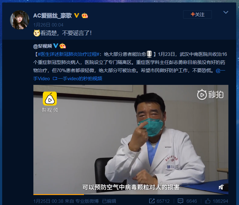 17 tahun lalu, saya melewati wabah SARS dan tuberkulosis saya mengalami kalsifikasi, dan tidak merasa begitu menakutkan. Sekarang saya sudah mengalami epidemi baru lagi. Saya sekarang berada di Hankou, Wuhan. Saya memakai masker setiap hari untuk keluar dan membeli makanan. Jangan biarkan kepanikan membuat Anda kehilangan akal sehat. Wabah ini tidak seheboh yang diberitakan.