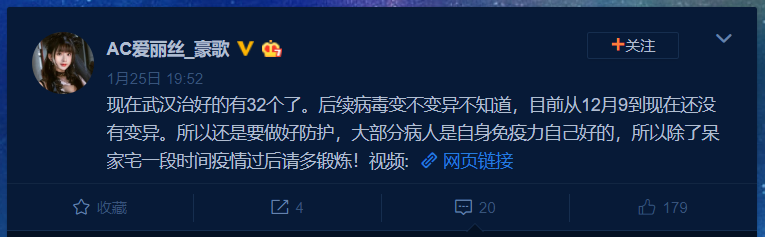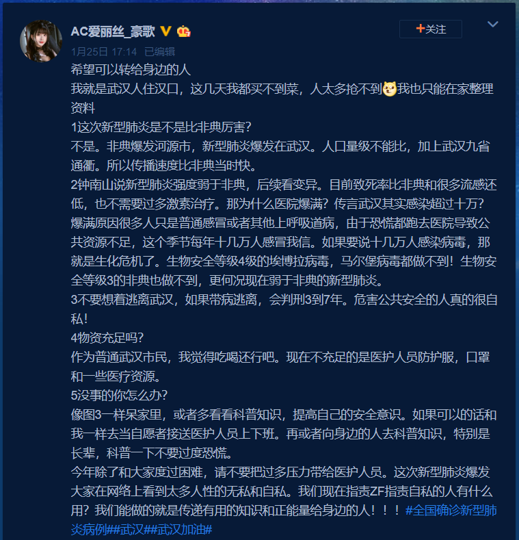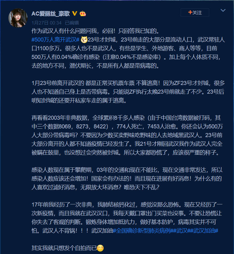 Kabar di atas tentu tidak lengkap tanpa pos yang ia buat sendiri di akun Weibonya langsung. Ada beberapa pos tambahan terkait wabah yang melanda kotanya.