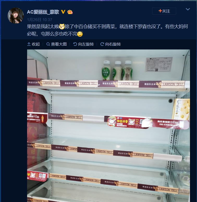 Benar saja, saya terlambat bangun. Saat saya pergi ke supermarket Zhongbai, saya tidak bisa membeli sayuran. Lawson di lantai bawah juga kosong. Mengapa beberapa emak-emak memiliki begitu banyak makanan?