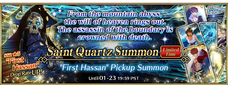 Fate/Grand Order versi NA (Amerika Utara) mengumumkan kemunculan sekaligus rate-up gacha dari “First Hassan“, kelas assassin dengan pangkat SSR yang merupakan karakter terkuat dalam kelasnya. Pemain dapat mendapatkannya dalam waktu yang terbatas, mulai 1 Januari, 10.00 WIB, sampai dengan 24 Januari 2019, 09.59 WIB. Siapa sebenarnya “First Hassan” dan apa yang menyebabkan ia menjadi karakter yang sangat diinginkan?