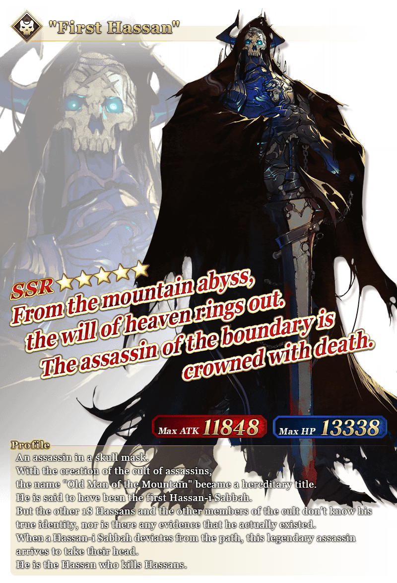 Fate/Grand Order versi NA (Amerika Utara) mengumumkan kemunculan sekaligus rate-up gacha dari “First Hassan“, kelas assassin dengan pangkat SSR yang merupakan karakter terkuat dalam kelasnya. Pemain dapat mendapatkannya dalam waktu yang terbatas, mulai 1 Januari, 10.00 WIB, sampai dengan 24 Januari 2019, 09.59 WIB. Siapa sebenarnya “First Hassan” dan apa yang menyebabkan ia menjadi karakter yang sangat diinginkan?