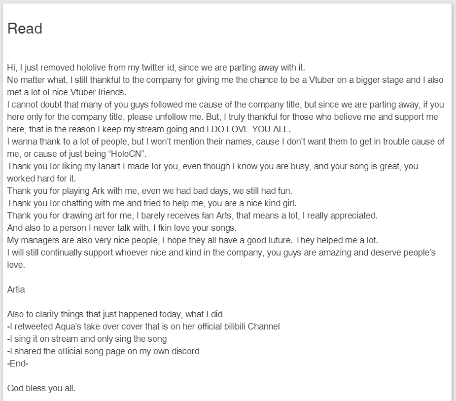 Setelah live streaming tersebut, Artia juga menulis kata-kata perpisahan dari Hololive di Twitternya. Ia juga telah mengganti username Twitternya menjadi @Artia_OW. Hal ini kemungkinan besar juga akan diikuti oleh (mantan) anggota Hololive CN lainnya, total ada 6 anggota.