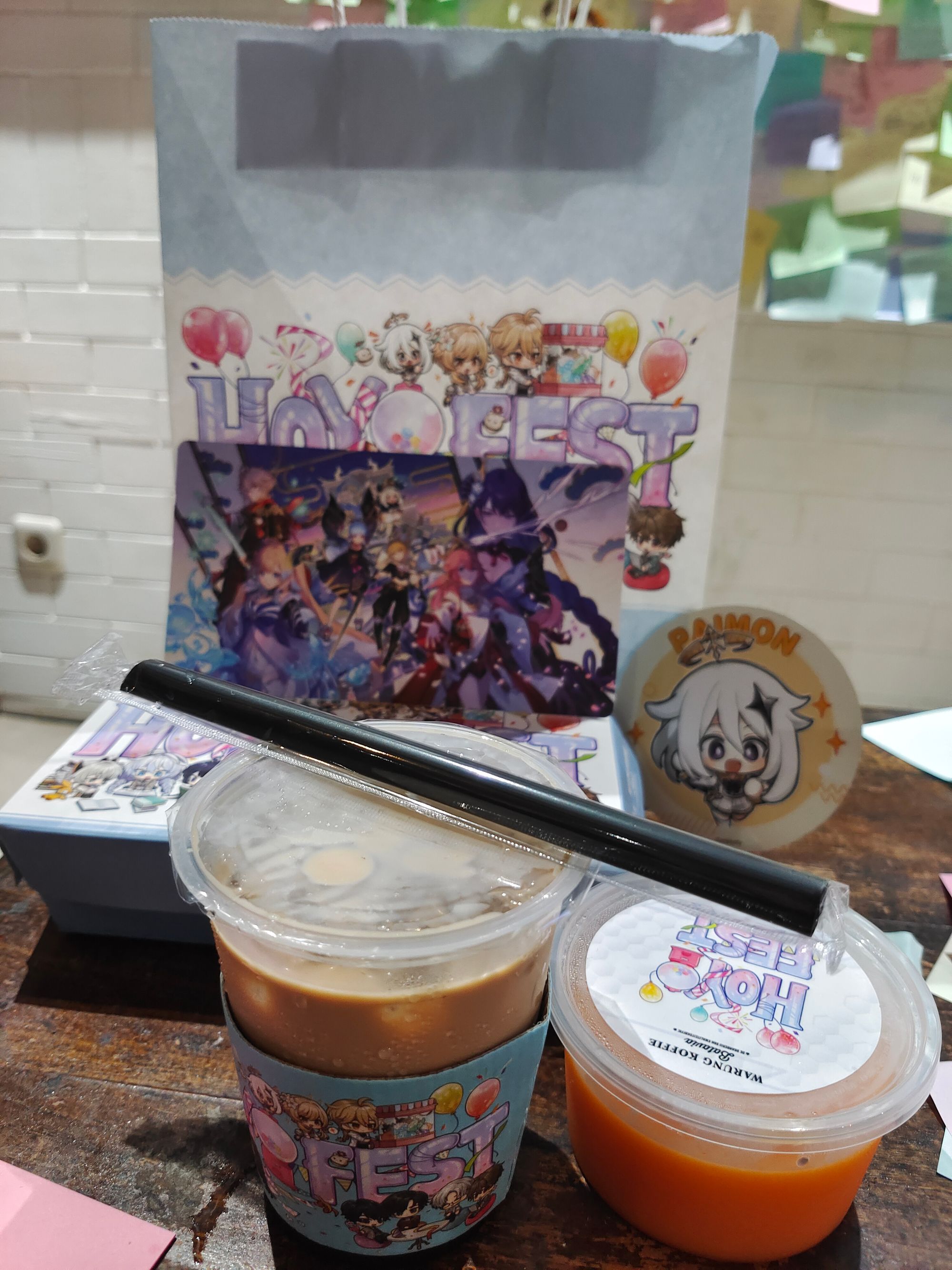 Sekarang, mari kita bahas merchandise gratis, yang didapatkan setiap pembelian makanan dan minuman minimal Rp 100.000. Anda akan mendapatkan goodie bag HoYo FEST yang berisi postcard, stiker dan tatakan gelas. Jangan lupa untuk mencicipi pudding gratis sehabis makan!