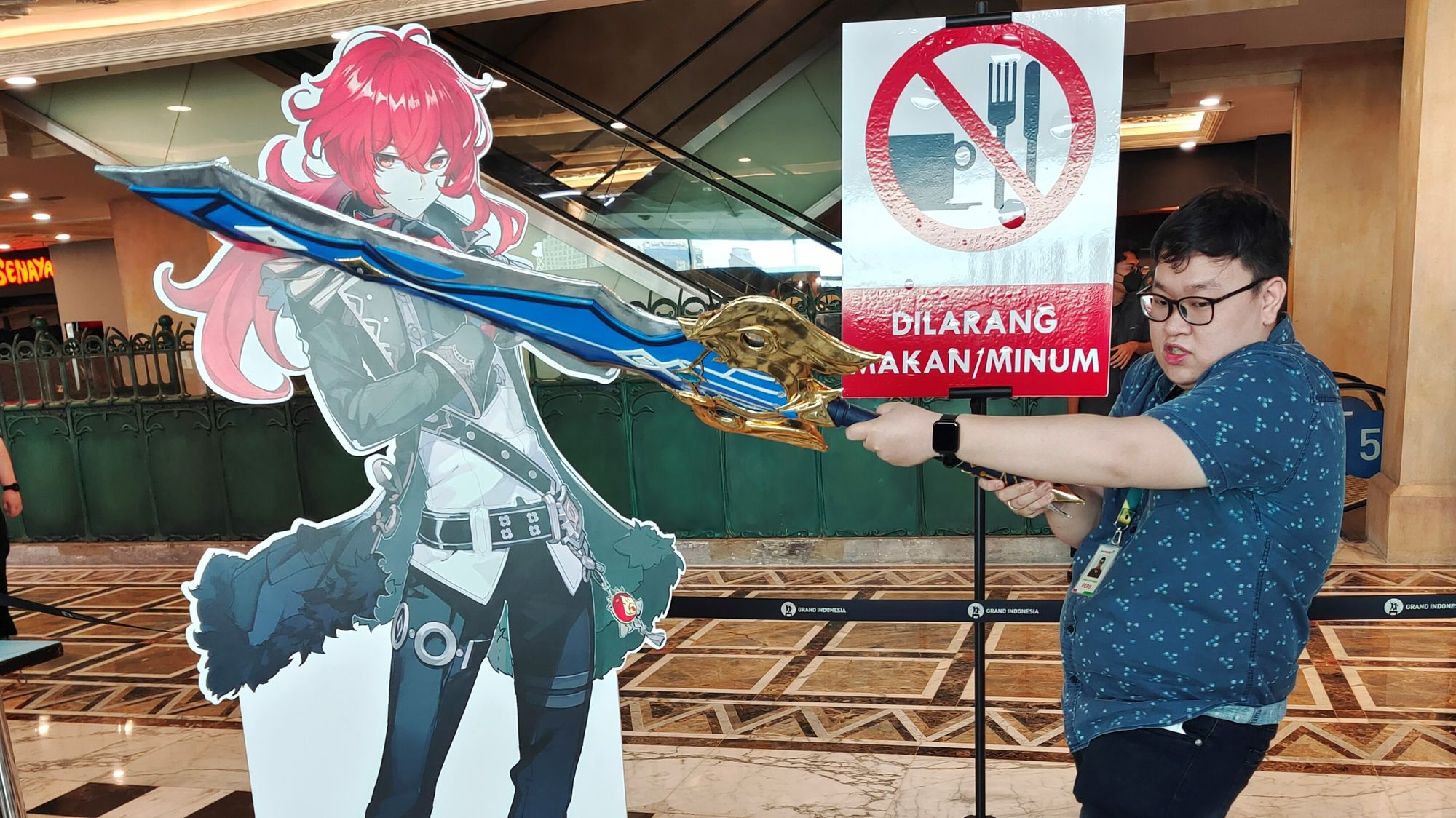 Satu hal lagi yang tak boleh dilewatkan di sini adalah berfoto dengan prop senjata yang disediakan. Senjata yang dihadirkan berbeda-beda tiap harinya. Saat penulis datang ke lokasi, senjata yang dihadirkan adalah 'Song of Broken Pines', signature weapon Eula. Di hari lain, Anda akan mendapatkan Amos Bow atau Engulfing Lightning, atau mungkin senjata lain.