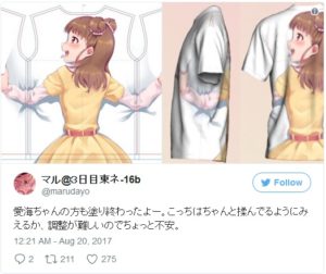 Tidak lama kemudian, ia menggambar sebuah ilustrasi Atsumi Munakata dari THE iDOLM@STER. Gambar yang ia buat sebenarnya hanyalah kebetulan dan ia mengkombinasikan gambar ilustrasi warna tersebut kedalam sebuah rancangan desain T-Shirt.