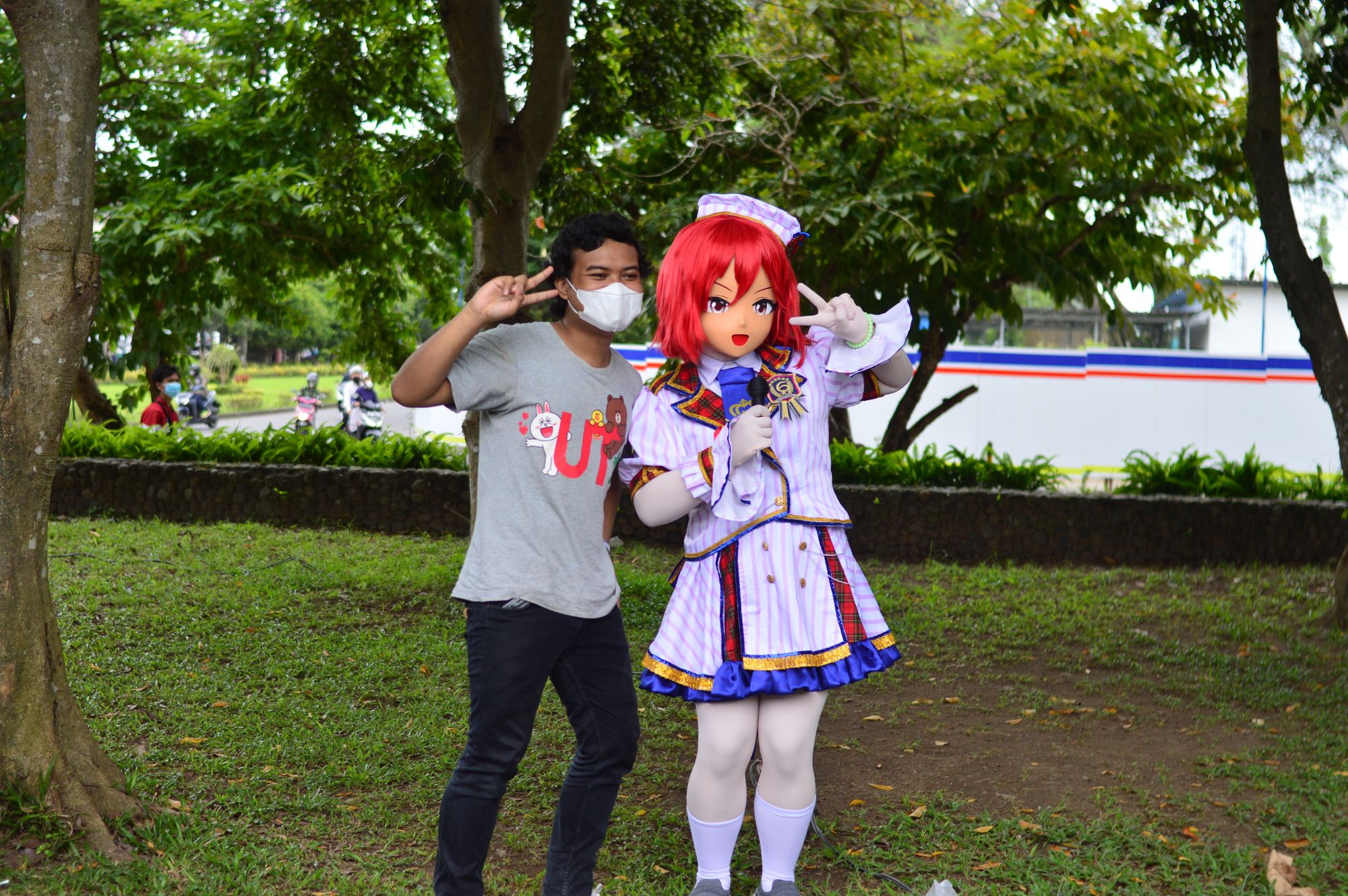 Cosplayer dengan "Kigurumi" dari seri The Idolm@ster Cinderella Girls berfoto dengan pengunjung (Foto: Irfan Clover)