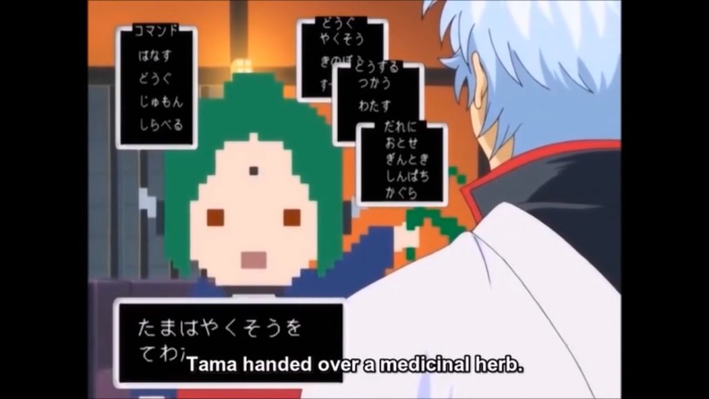 Siapa yang tidak kenal Gintama? Sebuah serial anime Shonen Jump yang sangat terkenal akan berbagai parodinya yang konyol dan sukses mengocok perut kalian. Mungkin parodi Dragon Quest pada Gintama bisa terbilang lumayan banyak. Namun khusus pada arc Tama Quest, sesuai dengan nama arcnya, disini diceritakan bahwa Tama terkena virus yang menyebabkan dirinya melakukan gerak gerik ala mekanisme Dragon Quest. Seperti bentuk rupa yang menyerupai sprite 8-bit, interface yang muncul setiap Tama ingin melakukan sesuatu, sampai dialog yang muncul untuk menerangkan hal – hal yang dilakukan Tama.