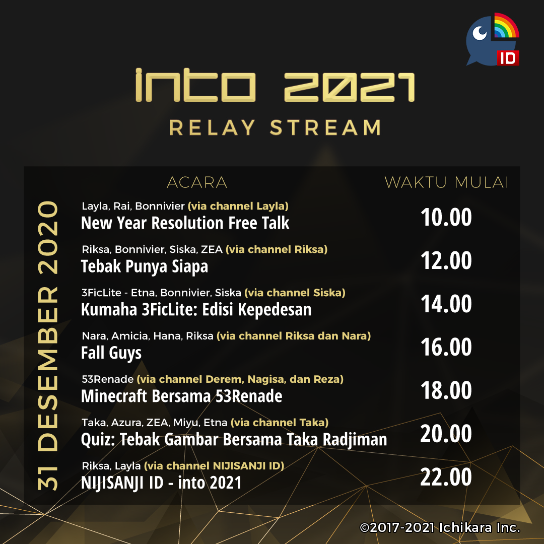Menyambut tahun baru, NIJISANJI ID akan mengadakan rangkaian acara stream berbentuk estafet bersama para Virtual Liver NIJISANJI ID yang berjudul Into 2021. Acara ini akan berlangsung di channel-channel Virtual Liver NIJISANJI ID di 31 Desember 2020 dari pukul 10.00 WIB sampai 24.00 WIB.