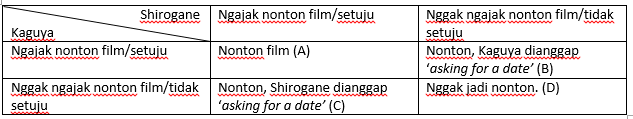 Posisi ideal tentu (A). Namun, dikarenakan adanya kemungkinan Kaguya atau Shirogane untuk mendapatkan pencapaian (kemenangan atau kepuasan) pribadi tertinggi (B/C), maka yang kemudian terjadi adalah keputusan yang tidak mencapai potensi tertingginya, berada dalam ekuilibrium Nash (D).