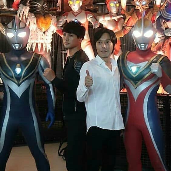 Hassei Takano (Kiri), pemeran Hiroya Fujimiya sang Ultraman Agul dan Takeshi Yoshioka (kanan), pemeran Gamu Takayama sang Ultraman Gaia.