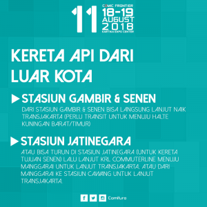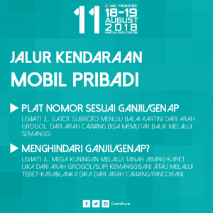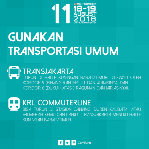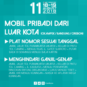 Kartika Expo Center, Balai Kartini, Jakarta Selatan kembali menjadi saksi lahirnya beragam karya kreatif asal kreator berbakat dari Indonesia di ajang Comic Frontier 11. Lalu lintas di sekitar Balai Kartini akan menjadi akses jalan utama pemberlakuan rekayasa lalu lintas dan pengalihan arus untuk pembukaan Asian Games. Sehubungan dengan kondisi lalu lintas tersebut, berikut ini adalah beberapa panduan lalu lintas dan transportasi umum yang perlu diketahui oleh seluruh kreator dan pengunjung yang akan menghadiri Comifuro 11.