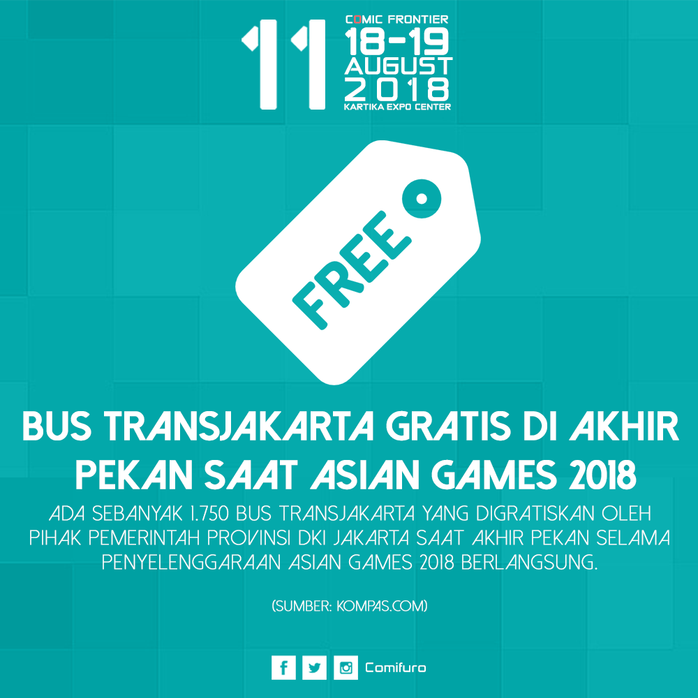 Khusus untuk pengguna bus Transjakarta, pemerintah provinsi DKI Jakarta menggratiskan bus Transjakarta saat akhir pekan selama penyelenggaraan Asian Games 2018. Ada sebanyak 1.750 bus Transjakarta yang digratiskan oleh pihak pemerintah provinsi DKI Jakarta. Layanan gratis bus Transjakarta ini bisa menjadi alternatif transportasi umum untuk partisipan dan pengunjung yang akan datang ke Comic Frontier 11.