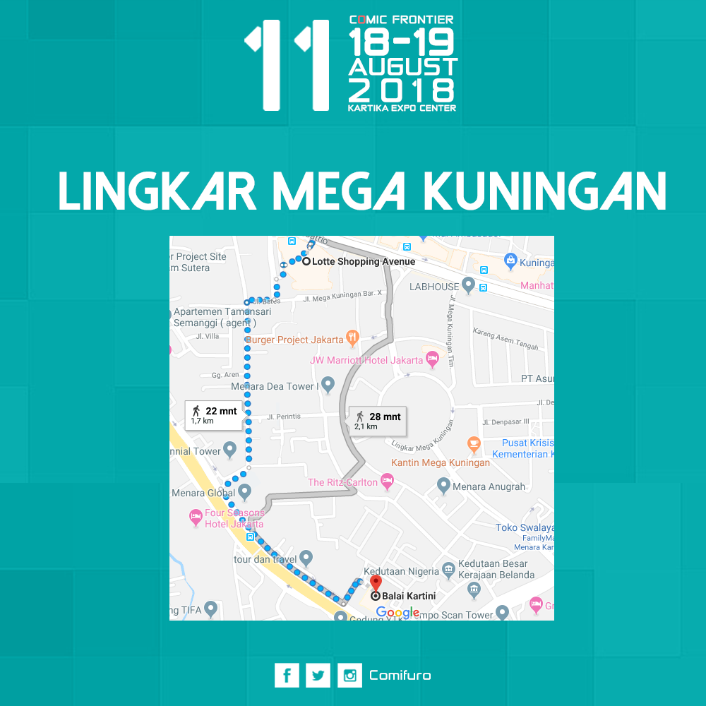 Kartika Expo Center, Balai Kartini, Jakarta Selatan kembali menjadi saksi lahirnya beragam karya kreatif asal kreator berbakat dari Indonesia di ajang Comic Frontier 11. Lalu lintas di sekitar Balai Kartini akan menjadi akses jalan utama pemberlakuan rekayasa lalu lintas dan pengalihan arus untuk pembukaan Asian Games. Sehubungan dengan kondisi lalu lintas tersebut, berikut ini adalah beberapa panduan lalu lintas dan transportasi umum yang perlu diketahui oleh seluruh kreator dan pengunjung yang akan menghadiri Comifuro 11.
