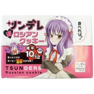 Selain pizza, Jepang juga sudah pernah membuat inovasi makanan yang terinspirasi oleh tsundere, contohnya adalah kukis tsundere. Kukis tsundere ini biasanya dipakai Youtuber untuk membuat konten raffle ataupun challenge. Dalam satu kotak kukis ini, tidak semua kukis rasanya pedas melainkan hanya beberapa. Mungkin ini untuk menyimbolkan bahwa dalam seorang tsundere tetap ada sikap manis meskipun sekali-sekali mereka juga akan bersikap dingin. Kukis tsundere seharga Rp57.000,- ini dijual oleh candysan untuk pemesanan luar Jepang. Di dalam Jepang pun tidak sembarang toko menjual kukis tsundere ini.