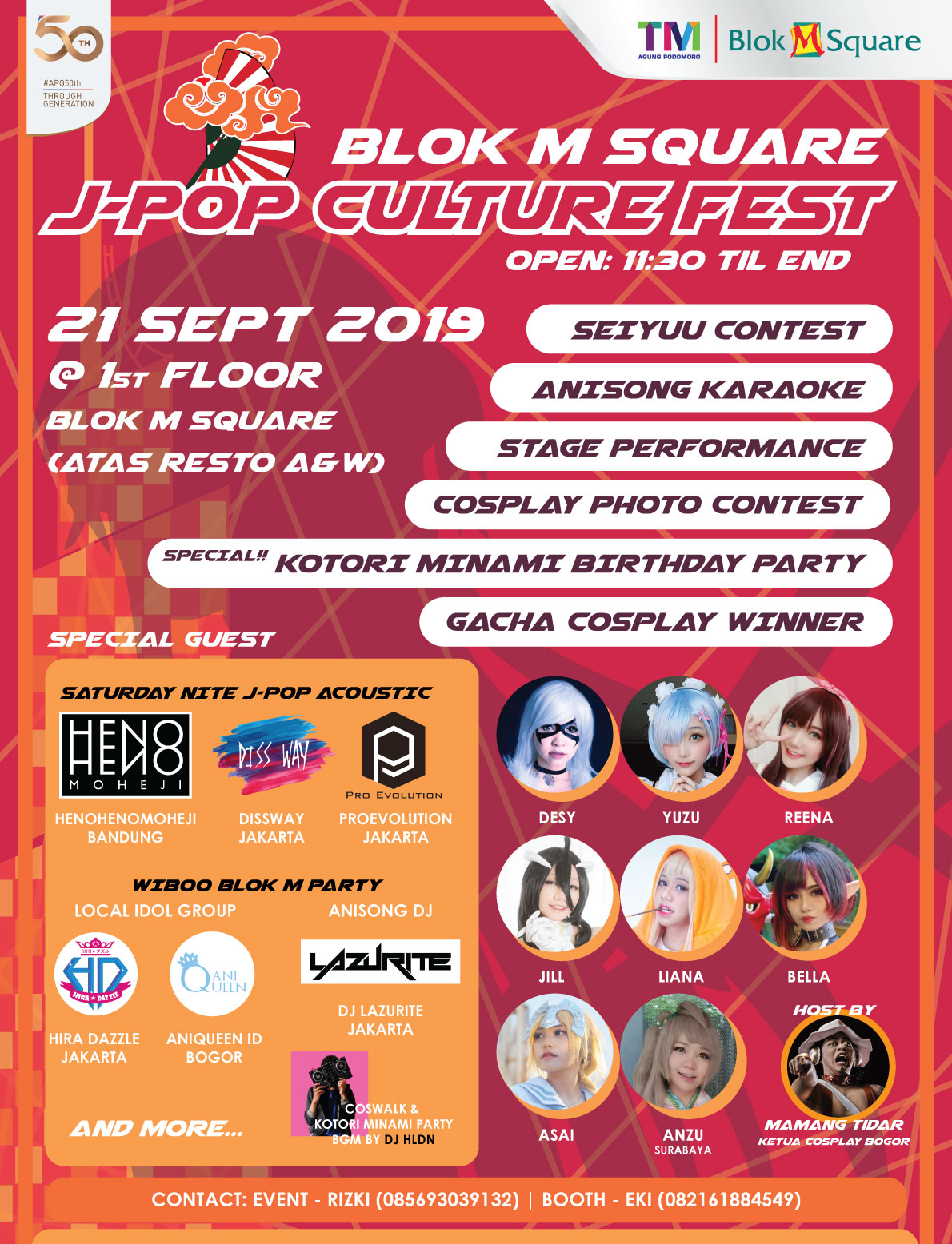 Setiap tahun, kawasan Blok M selalu mengadakan acara akbar tahunan festival kebudayaan Jepang yang menarik banyak massa pecinta kebudayaan tersebut. Terilhami oleh hal tersebut, Blok M Square bekerjasama dengan salah satu panitia acara festival tersebut. Sebuah acara yang khusus diselenggarakan di dalam gedung Blok M Square, dengan nama Blok M Square J-Pop Culture Fest. Acara ini sendiri hanya khusus bertema Pop Culture Jepang, karena pihak Blok M Square ingin mendukung berkelanjutannya ciri mall yang identik dengan kebudayaan Jepang, terutama generasi muda. Acara ini akan dilaksanakan tanggal 21 September 2019 dari pukul 11:30 sampai selesai