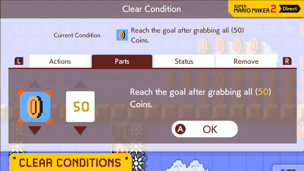 Kini level – level yang sebelumnya sangat menantang akan jauh lebih menantang dari sebelumnya. Kalian sekarang bisa mengatur clear condition untuk level kalian sendiri, seperti mengumpulkan 50 koin, menghabisi musuh tertentu dalam jumlah yang ditentukan, dan masih banyak lagi clear condition lainnya.