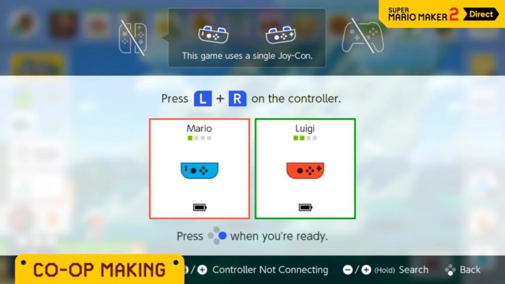Kalian bisa berbagi Joy-Con milik kalian untuk bermain bersama. Multiplayer ini bisa dilakukan sampai empat pemain. Kalian bisa berkolaborasi dengan teman kalian untuk merancang level bersama, sampai memainkan online course bersama. Super Mario Maker 2 hanya bisa menggunakan satu Joy-Con saja, tidak bisa menggunakan dua Joy-Con dan Pro Controller.