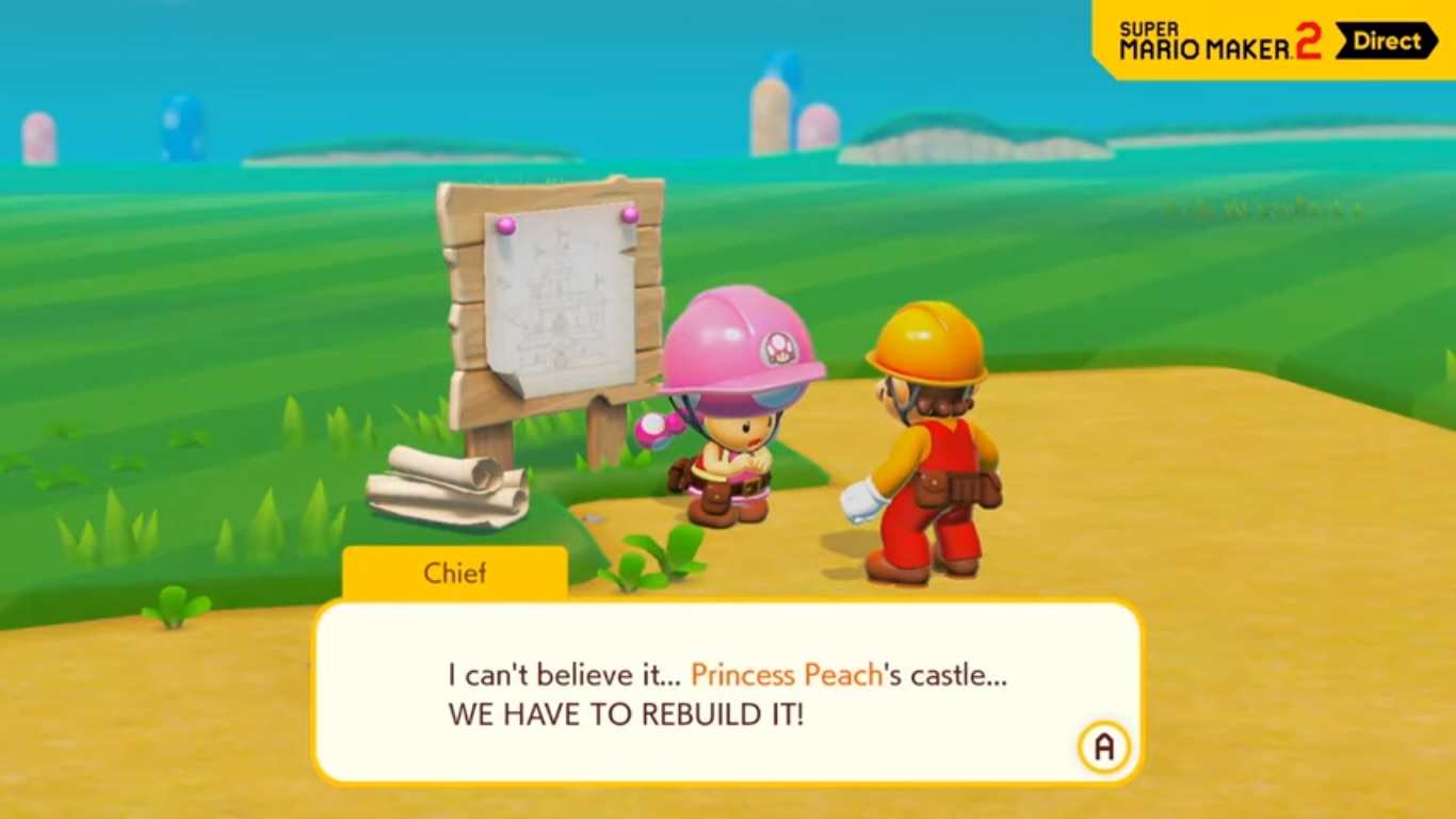 Pada gim Super Mario Maker 2, kalian bisa memainkan story mode untuk gim ini. Pada story mode ini, Mario ditugaskan untuk membangun kembali istana milik Princess Peach yang hancur. Kalian akan memainkan level – level tradisional khas Super Mario Bros pada umumnya, dan mengumpulkan koin untuk upaya rekonstruksi istana itu.