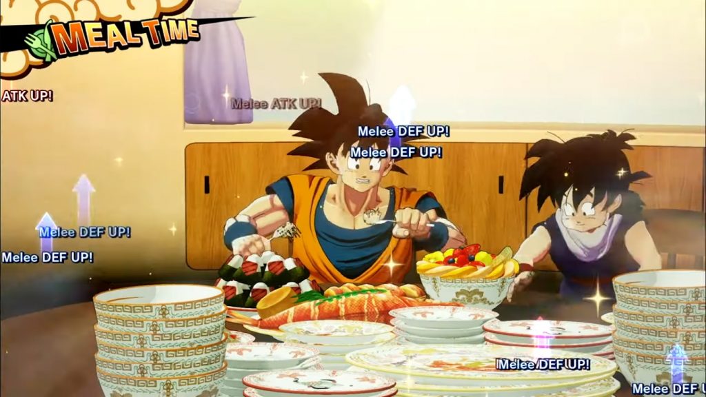 Tentunya para fans tua tidak akan melupakan adegan yang paling menyegarkan sepanjang sejarah Dragon Ball, yaitu balap – balapan makan. Dragon Ball Z: Kakarot memberikan sesi meal time, dimana Goku dan Gohan disini balap – balapan makan terbanyak. Setiap makanan yang dimakan juga membantu menambahkan status tertentu untuk kedua karakter.