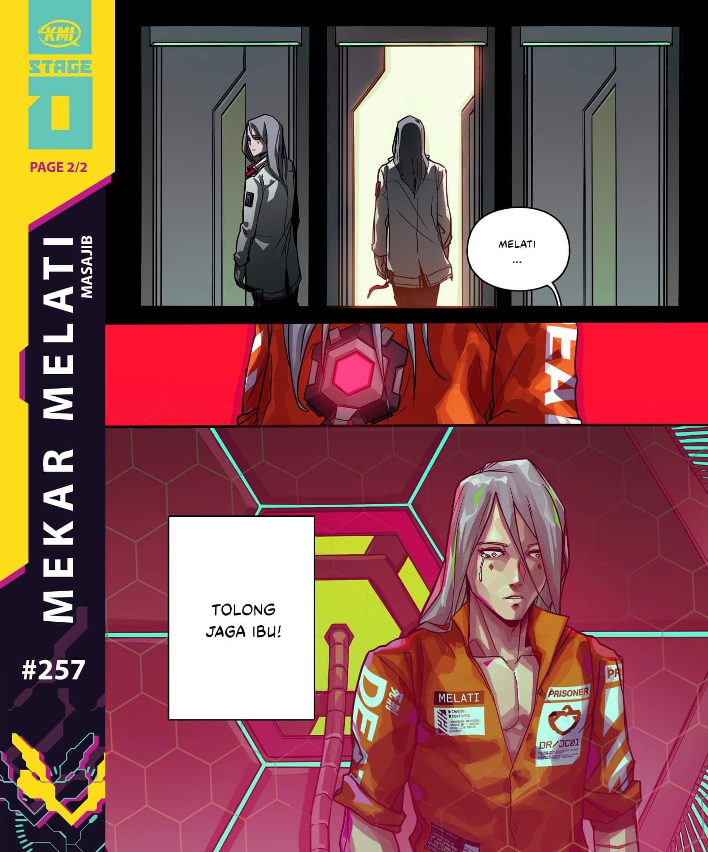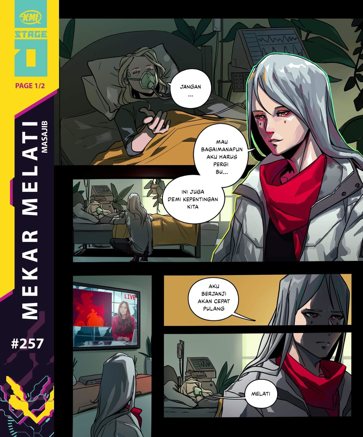 Ibs: “Overall, saya termasuk suka penggunaan warna seperti ini. Dari segi cerita juga oke. Dalam dua halaman ini, ada alur flashback dengan transisi yang baik. Paling hanya posisi karakter pada halaman 1 yang agak menuhi, meski saya tahu itu untuk penegasan raut wajahnya. Saya juga suka karakter Melati ini, terkesan tidak umum. Lelaki berambut panjang dan berwarna putih seperti namanya. Penggambaran karater Melati dalam Stage 0 ini juga bagus. Ada senyum palsu dan terkesan tidak jujur kepada sang Ibu dan di halaman dua setelah flashback, Melati mengeluarkan air mata, tanda bahwa dia menyesal akan keputusannya. Saya malah penasaran dengan lanjutan ceritanya. Bagusss.”