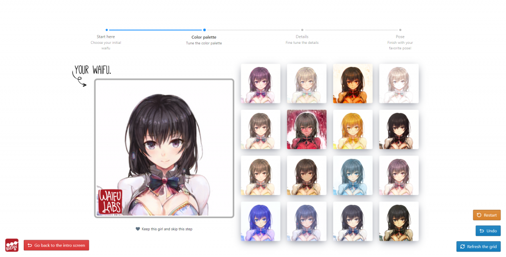 Disini saya memilih perempuan berambut hitam pendek sebagai dasar dari waifu yang saya inginkan. Setelah itu, saya diminta untuk memilih color palette yang saya inginkan — yang pada dasarnya berguna untuk mengubah warna rambut, mata, kulit, dan lain-lain.