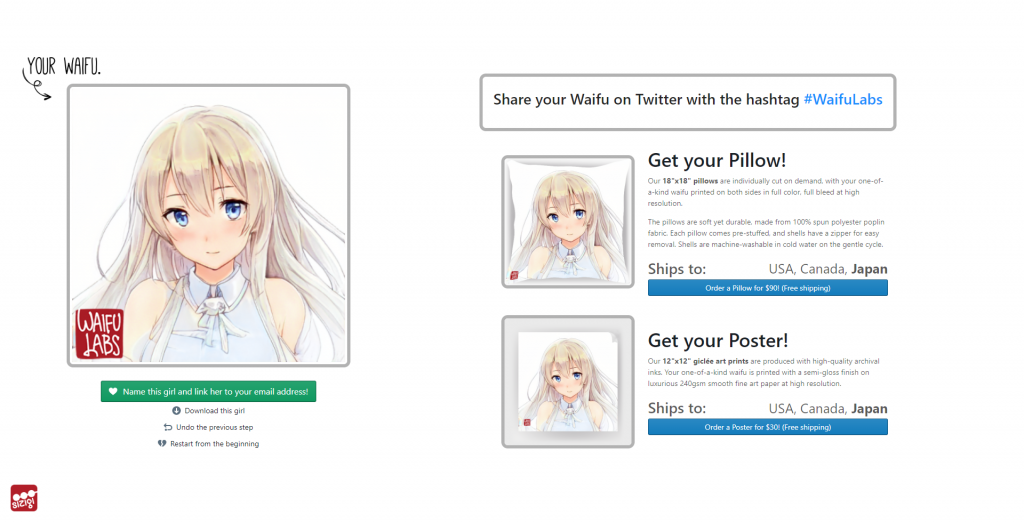 Selesai! Setelah sampai di tahap terakhir ini, saya diberi pilihan apakah mau membeli cover bantal maupun poster dari waifu yang telah saya buat ini. Sayangnya, mereka cuma menyediakan pengiriman ke Amerika Serikat, Kanada, dan Jepang _| ̄|○.