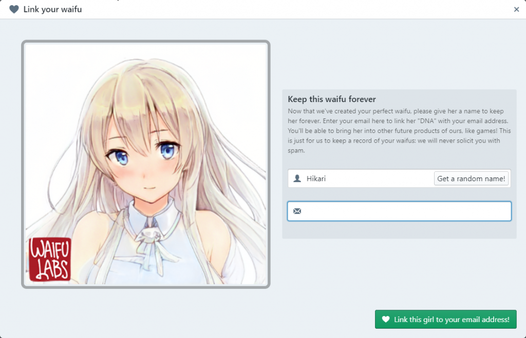 Di sini saya juga bisa klaim waifu saya dengan binding mereka ke email pribadi, jadi setiap kali saya pergi ke WaifuLabs.com, saya akan melihat waifu yang telah saya buat sebelumnya.