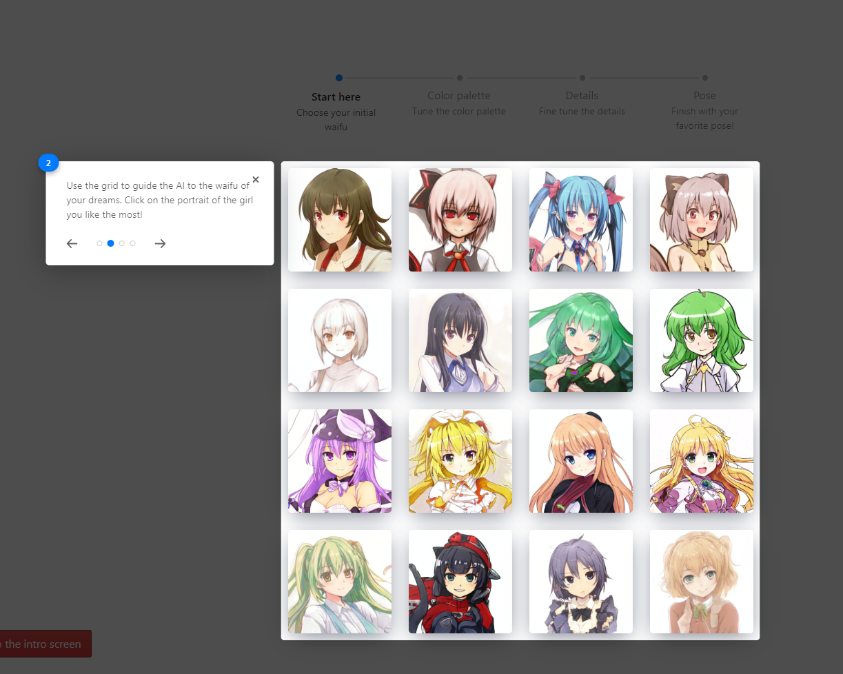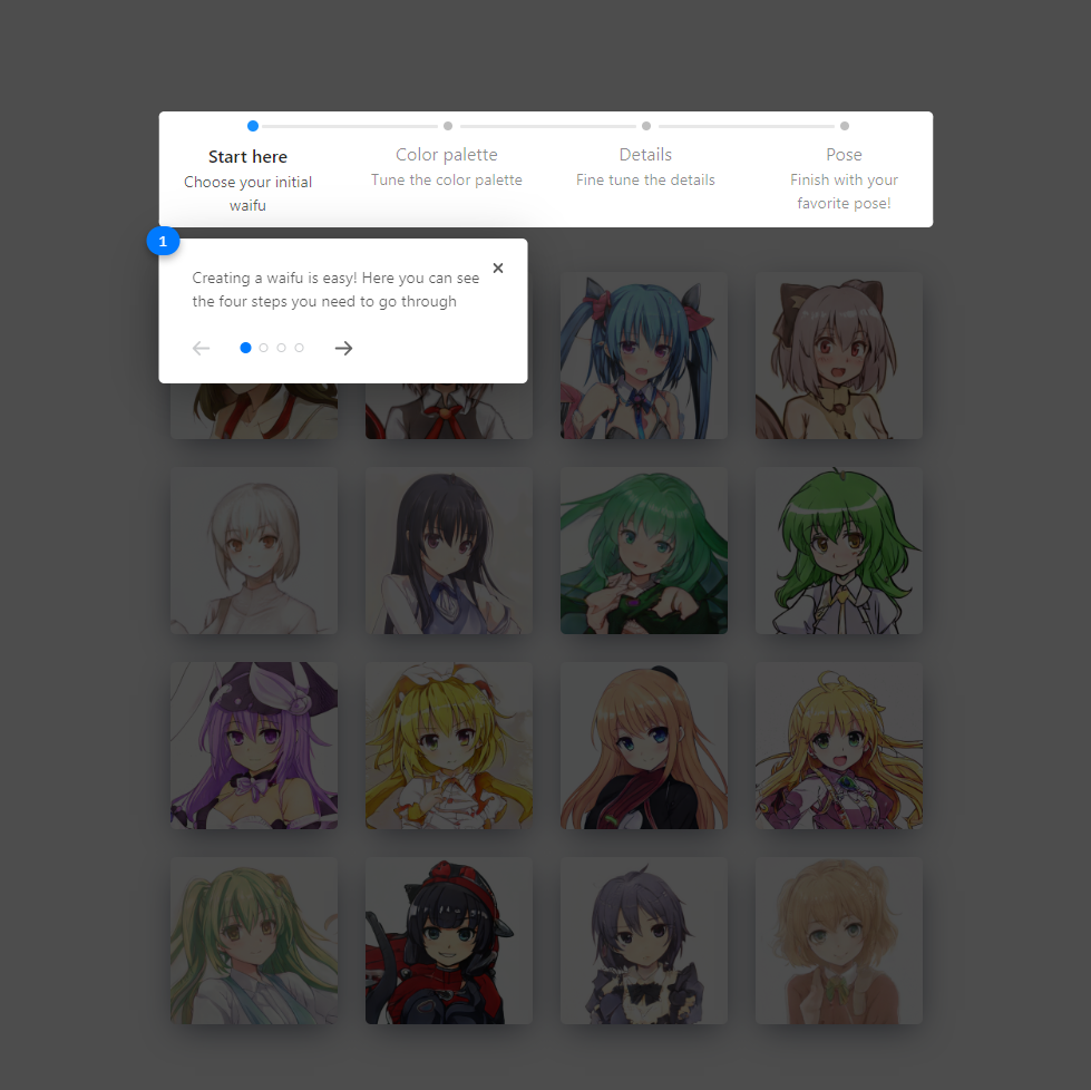 Tanpa lama menunggu, saya langsung klik [Meet your dream waifu], yang setelah itu disambut dengan tutorial pendek tentang bagaimana cara menggunakan website ini. Pada dasarnya cukup mudah, langkah pertama adalah memilih template yang paling kita suka.