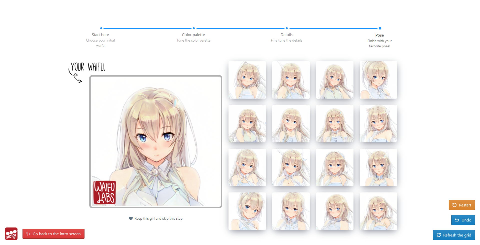 Sempurna! Waifu saya sudah selesai! Di tahap terakhir ini, saya diminta untuk memilih pose dan penyempurnaan dari desain waifu yang saya inginkan.