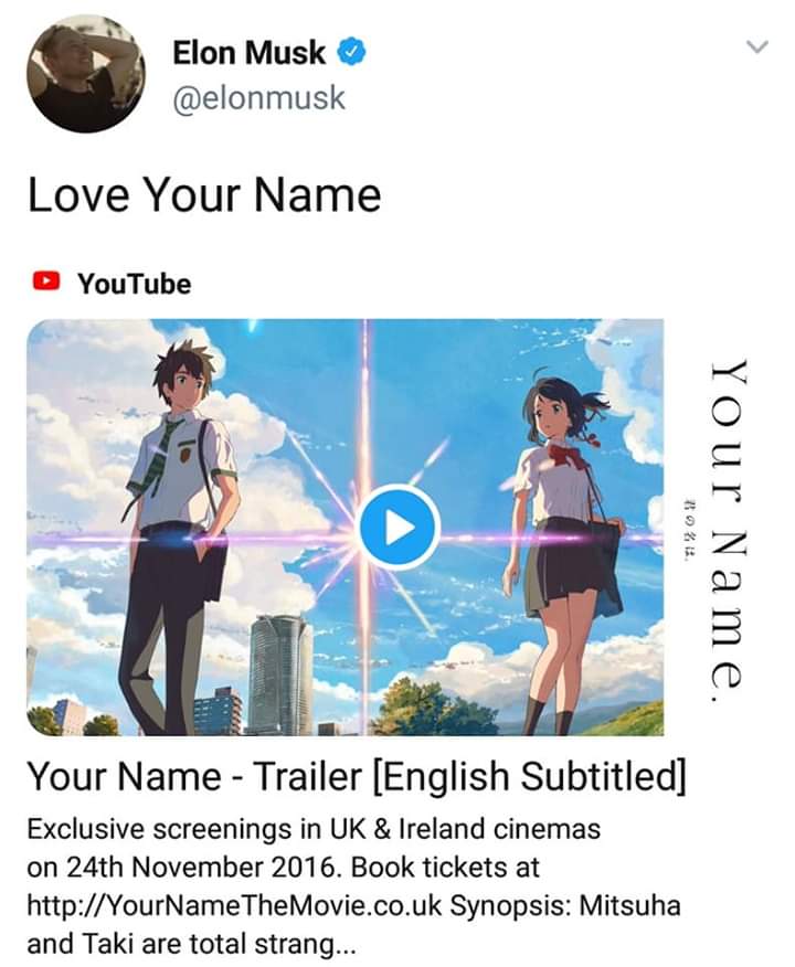 Jagat Twitter dihebohkan dengan tweet salah seorang pembesar terkenal Amerika yang merupakan tokoh bisnis, inventor sekaligus Industrialis, Elon Musk. Dirinya didapati dalam jagat Twitter memuji sebuah film karya Makoto Shinkai yang berjudul Your Name (Kimi no Na wa).