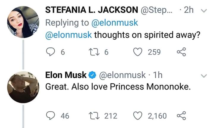 Aksi tersebut sontak membuat twitter milik Elon Musk dibanjiri dengan komentar para penggemar kebudayaan pop Jepang tersebut dengan bertanya serta mengkonfirmasi apakah Elon Musk suka dan tahu beberapa anime terkenal seperti anime buatan Studio Ghibli.