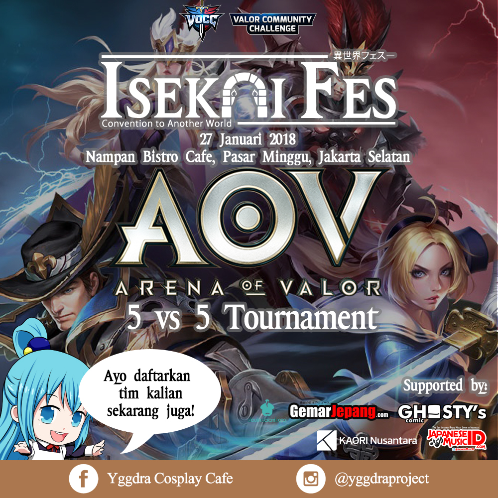 Tidak sebatas workshop dan photosession event saja, hal seru lainnya yang ada di acara IsekaiFes ini adalah Game Tournament. Untuk acara ini Yggdra Cosplay Cafe bekerjasama dengan komunitas game Capital mengadakan turnamen mobile game AOV (Arena of Valor). Turnamen resmi yang telah disetujui oleh Garena ini dilakukan dengan format VOCC (Valor Community Challenge) ini menggunakan aturan pertarungan tim 5 vs 5.