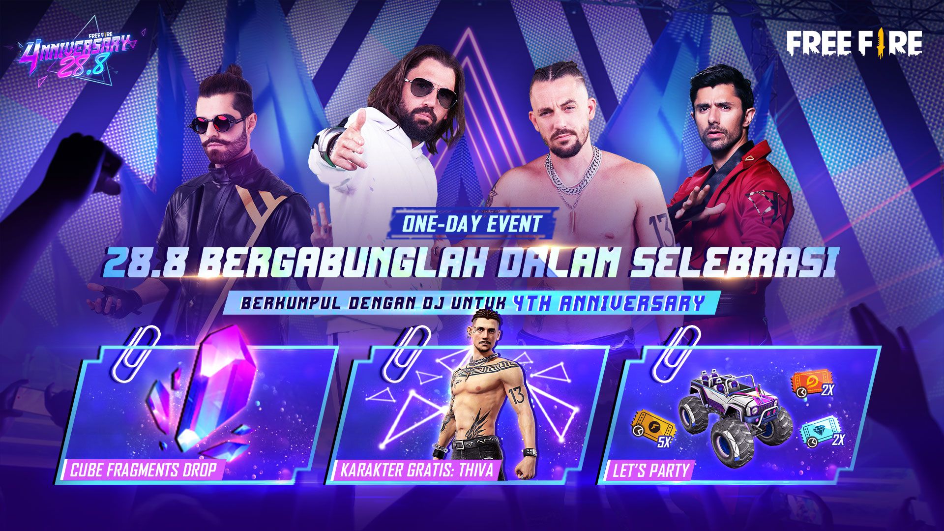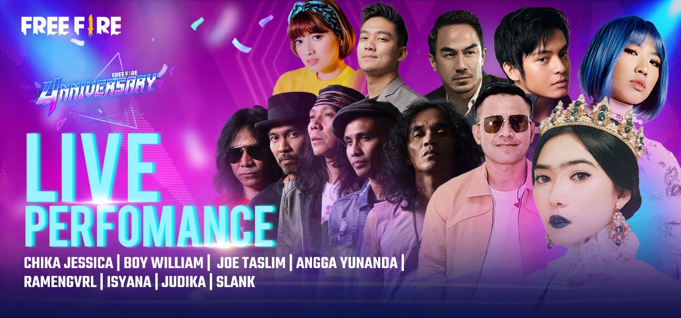 Garena Free Fire mengajak seluruh Survivors untuk ikut merayakan hari ulang tahun keempat di pesta 4nniversary. Sebagai momen penuh selebrasi, Free Fire akan mengadakan berbagai rangkaian kegiatan mulai dari turnamen bertajuk Tourniversary, acara perayaan berhadiah mobil, motor, handphone, dan TV, hingga pesta puncaknya bersama beberapa artis tanah air seperti Joe Taslim, Isyana, Slank, dan Angga Yunanda. Pesta perayaan ini nantinya akan disiarkan melalui televisi RCTI dan SCTV serta di akun resmi RCTI+, Facebook, dan Youtube Free Fire pada 27 Agustus 2021, pukul 19.00 - 20.00 WIB.