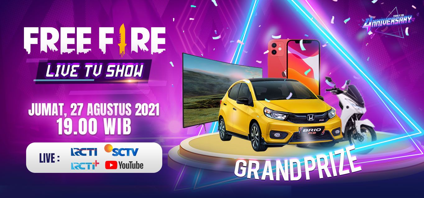 Untuk berbagi keseruan dengan seluruh masyarakat Indonesia, Garena Free Fire juga akan mengadakan acara perayaan di dua stasiun televisi nasional yang menghadirkan berbagai bintang tamu seperti Joe Taslim, Isyana, SLANK, Saykoji, dan Angga Yunanda. Selain bintang-bintang tersebut, acara ini juga akan menjadi ajang pemberian penghargaan (Awarding Night) kepada para pemain esports dan konten kreator Free Fire. Acara ini akan ditayangkan di tanggal 27 Agustus 2021, pukul 19.00 - 20.00 WIB secara langsung di televisi RCTI, dan SCTV, serta di akun resmi RCTI+, Facebook, dan Youtube Free Fire. Penonton nantinya juga dapat berpartisipasi dalam kesempatan mendapatkan berbagai hadiah yaitu mobil, motor, handphone, dan TV.