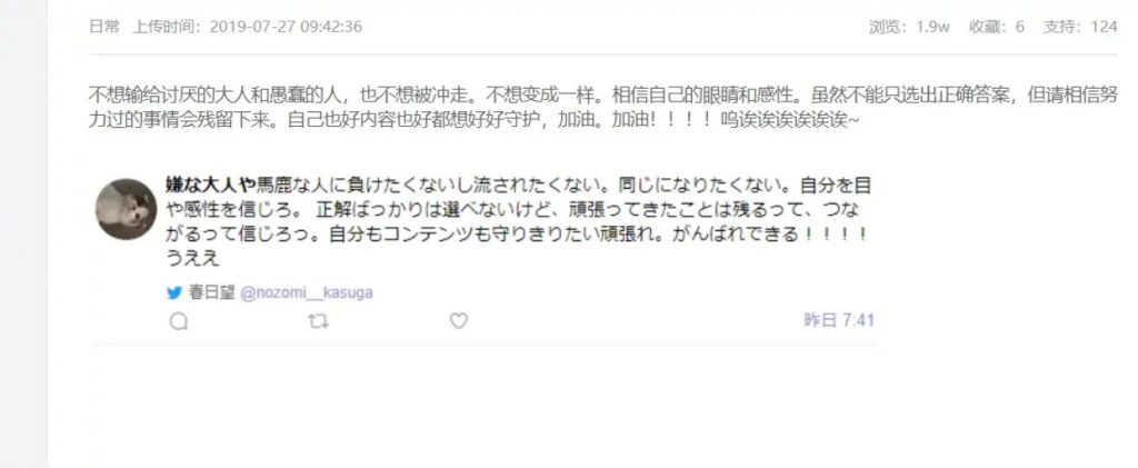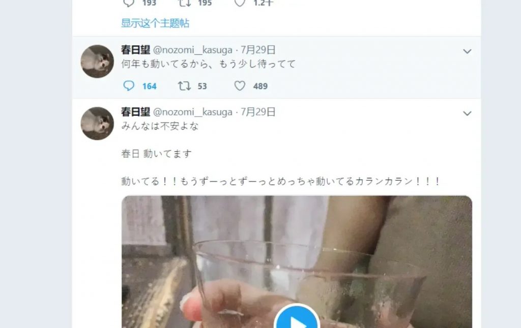 Saat para penggemar semakin khawatir, Seiyuu yang dianggap sebagai Kizuna Ai Orisinil, Kasuga Nozomi membuat dua Tweet baru yang dipercaya untuk menenangkan para penggemar Kizuna Ai Orisinil.
