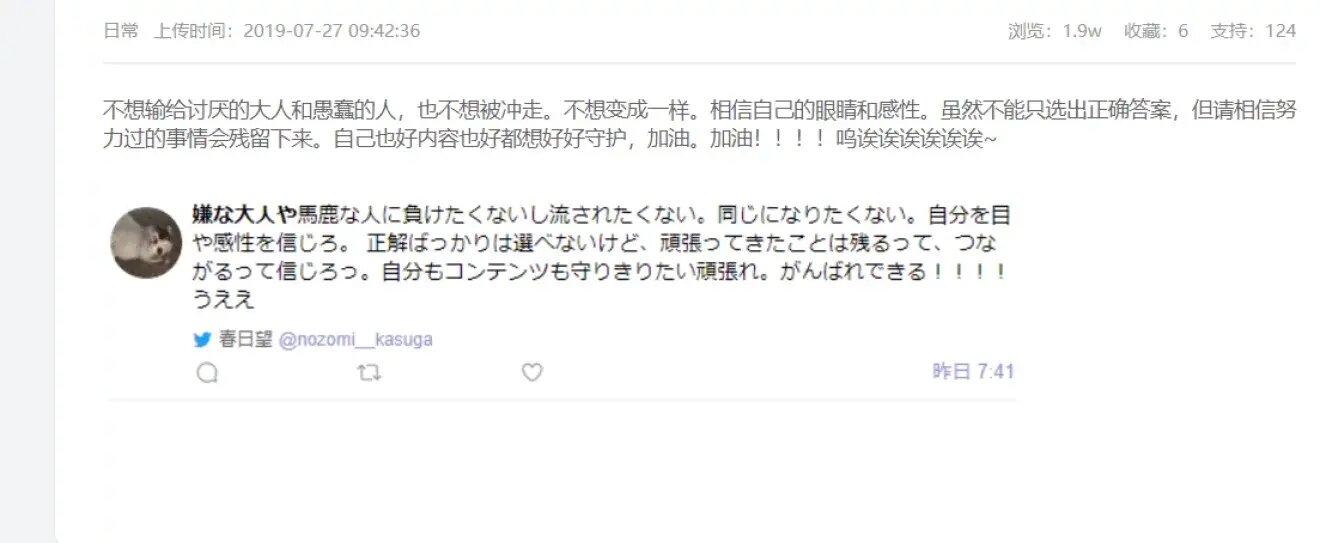 Saat para penggemar semakin khawatir, Seiyuu yang dianggap sebagai Kizuna Ai Orisinil, Kasuga Nozomi membuat dua Tweet baru yang dipercaya untuk menenangkan para penggemar Kizuna Ai Orisinil.