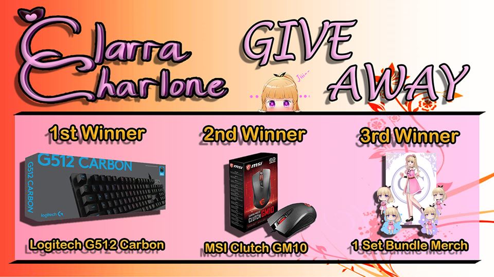 Tak tanggung-tanggung, jumlah hadiah giveaway yang diadakan Clarra Charlone mencapai 2 juta Rupiah! Hadiah berupa keyboard apik khusus untuk gim, tetikus dari MSI dan bundle Merchandise Clarra dapat anda dapatkan untuk yang mengikuti giveaway ini.