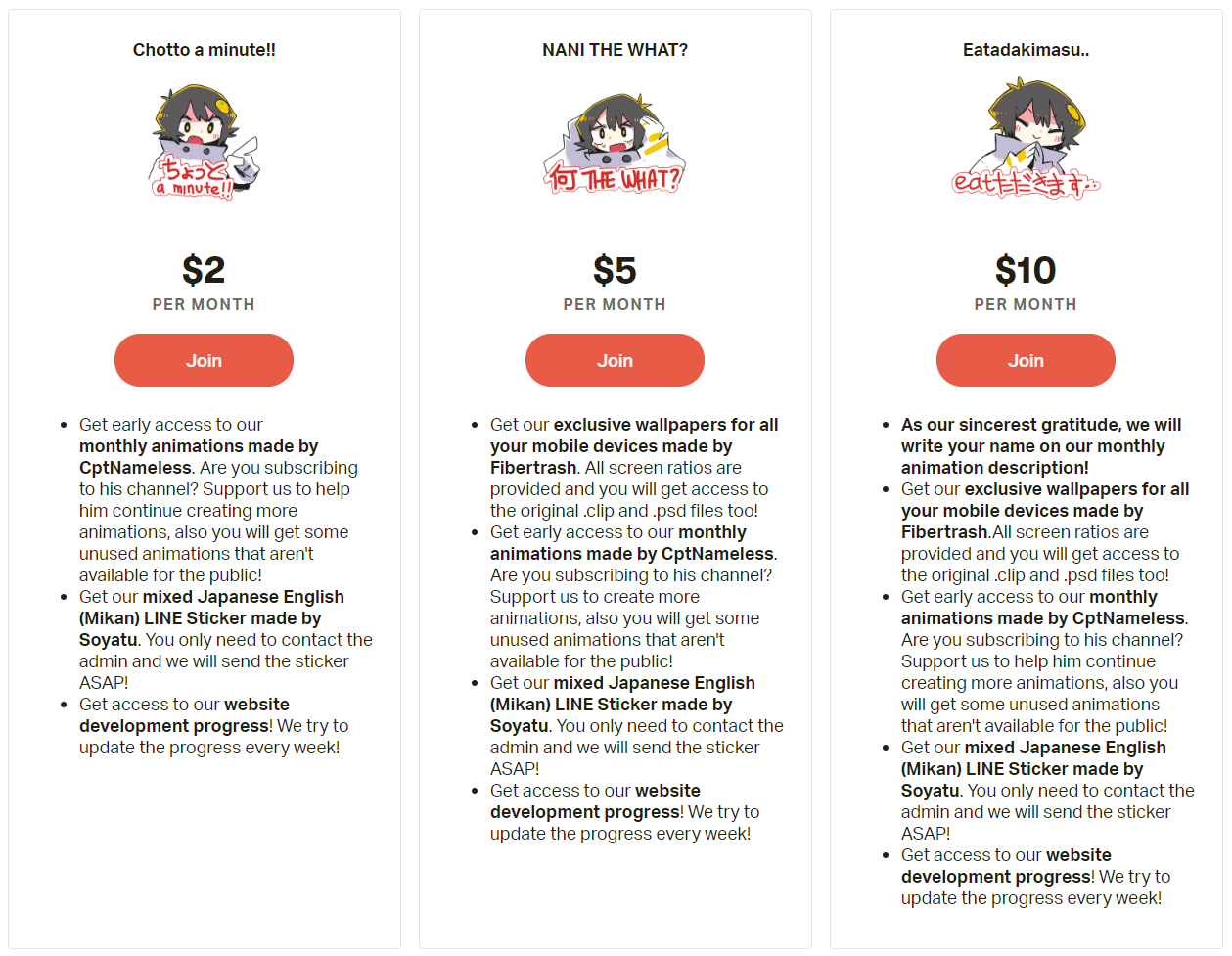 Jika membayar $5 per bulan, selain tiga keuntungan di atas, Anda juga akan mendapatkan wallpaper spesial Mikan untuk menghiasi ponsel Anda. Tambah $5 lagi ($10 per bulan), dan nama Anda akan terpatri abadi (baca: dicantumkan) di karya animasi Wibuverse!