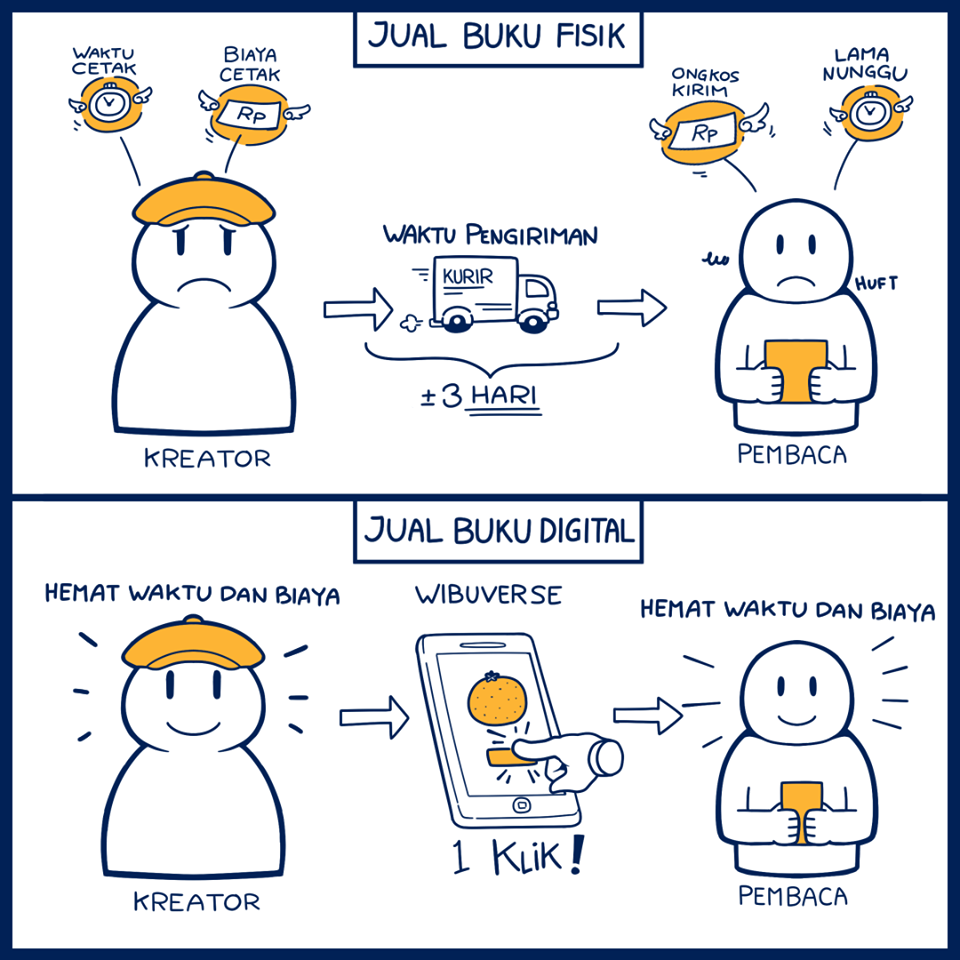 Di Wibuverse, buku-buku karya kreator dijual secara digital. Kreator tinggal mengunggah softcopy buku mereka ke Wibuverse, untuk kemudian dikurasi dan diterbitkan. Tidak perlu keluar biaya, waktu, dan tenaga untuk mencetak. Pembaca tinggal membeli dan mengunduh buku-buku tersebut di Wibuverse. Tidak perlu jauh-jauh datang ke event. Hemat waktu dan biaya untuk pembaca juga!